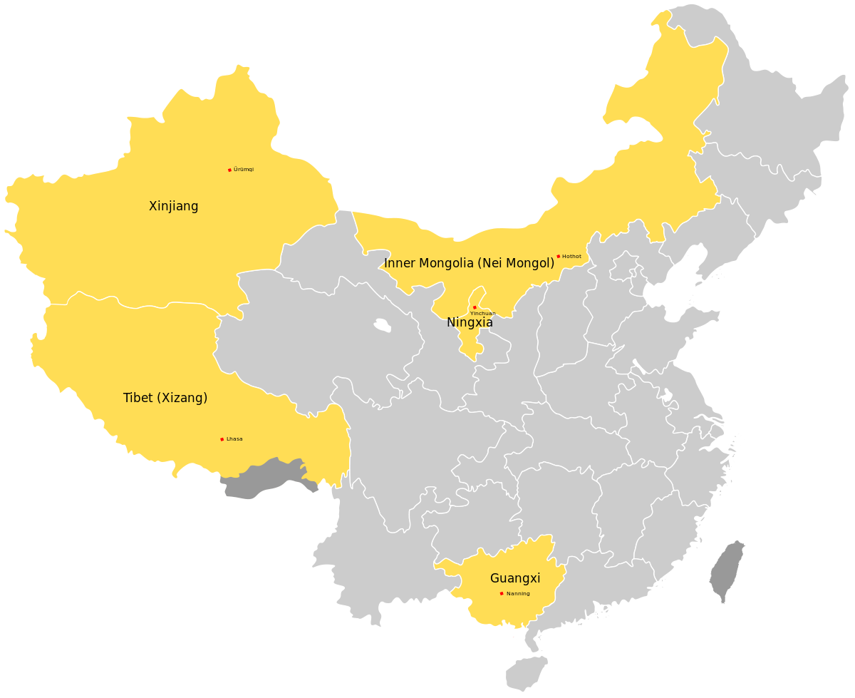 中国也有5个自治区:内蒙古,广西,宁夏,西藏,新疆。