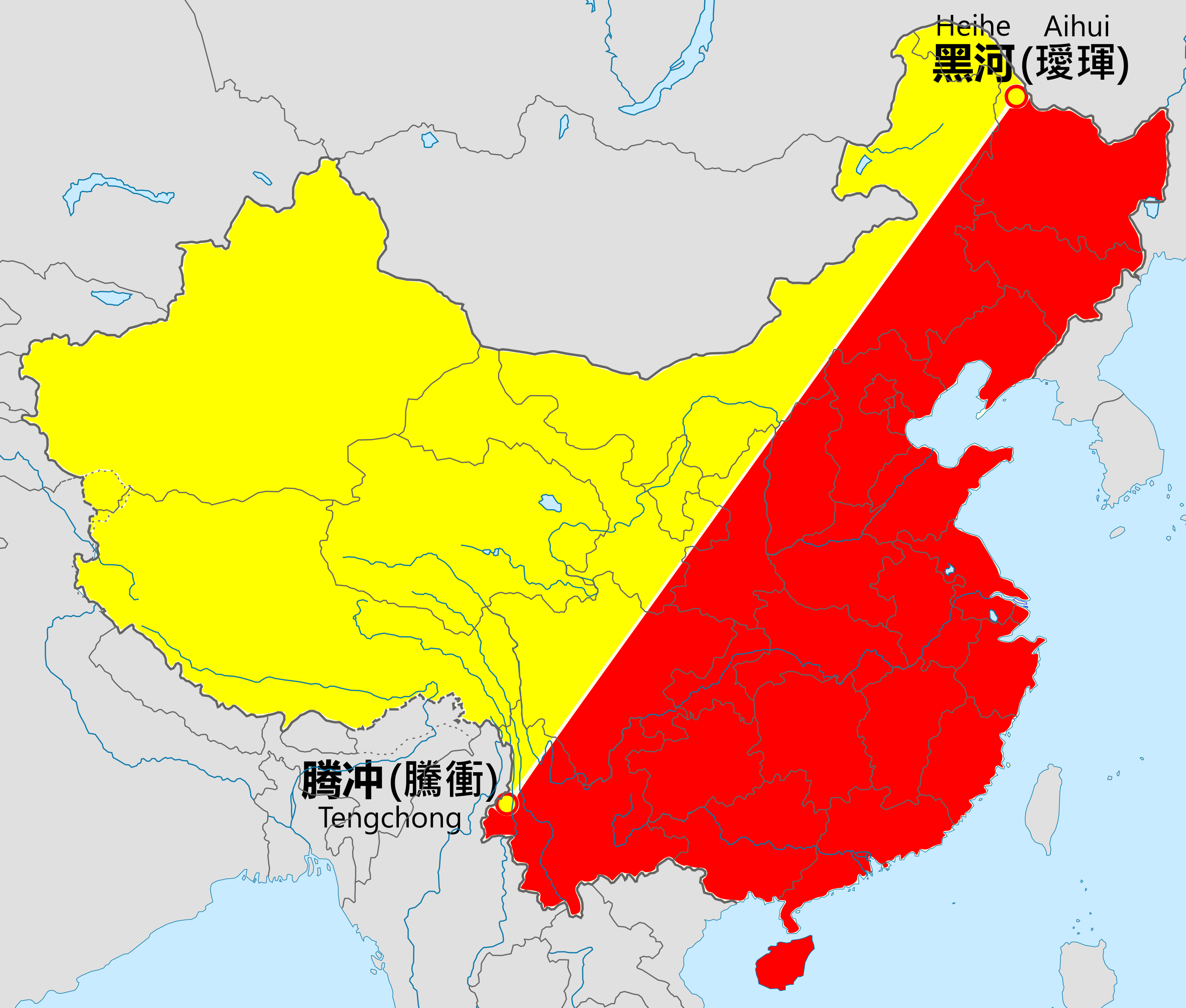 中国人很有意思。20% 世界人口在中住。中国有56个族群。中国有黑河–腾冲线,这是一条奇怪的线, 因为94% 的人在线得东边住。因为中国的东边能支持很多人。
